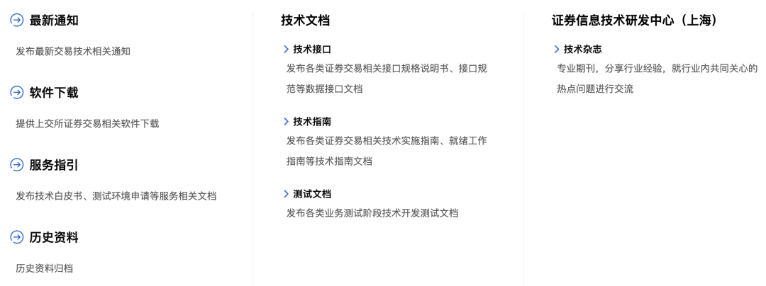 交易技术支持证券公司、基金公司、期货公司、银行、保险、上市公司、证券行业技术供应商等其他相关机构提供技术支持服务,包括交易技术方面的最新通知、前端报盘程序、接口指南文档、服务联系方式等;同时提供“证券信息技术研发中心(上海)”的技术期刊等技术交流内容。
