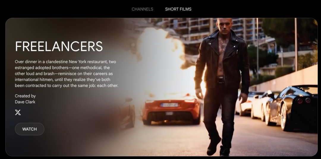 目前只放出了3部。比如下面这部名为「FreeLancers」,讲述了这样一个故事:在纽约一家秘密餐厅的晚餐中,两位久疏音信的养兄弟——一位做事谨慎、另一位喧闹且卤莽——回忆起他们作为国际杀手的职业生涯,直到他们意识到两人竟被雇佣去执行同一项任务:对方。