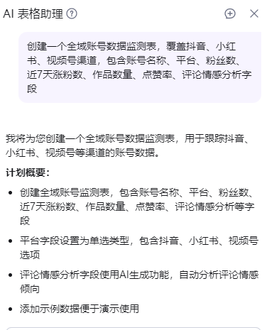 我向AI表格助理描述需求:“创建一个全域账号数据监测表,覆盖抖音、小红书、视频号渠道,包含账号名称、平台、粉丝数、近7天涨粉数、作品数量、点赞率、评论情感分析字段。”