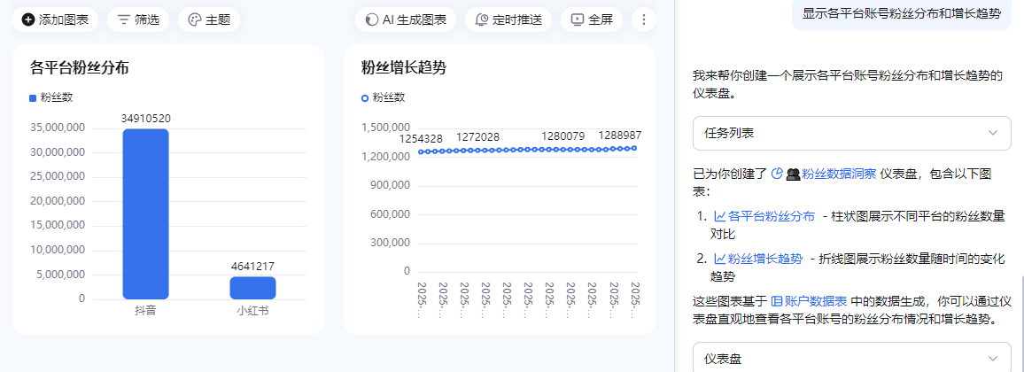 当我输入“显示各平台账号粉丝分布和增长趋势”时,AI瞬间创建了一个包含饼图和折线图的仪表盘,清晰展示了不同平台的账号布局和增长情况。