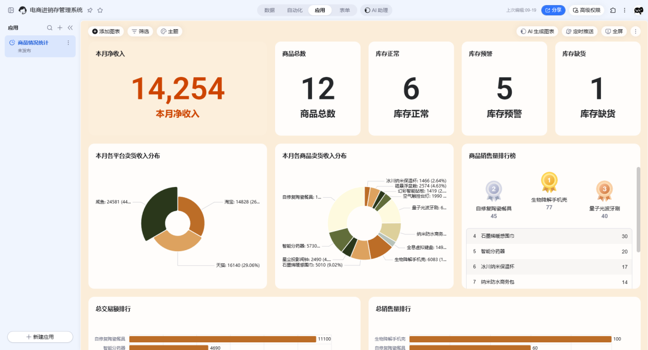 数据的价值在于能够转化为决策依据。AI 表格的应用模块支持将进销存数据以 仪表盘 的形式可视化: