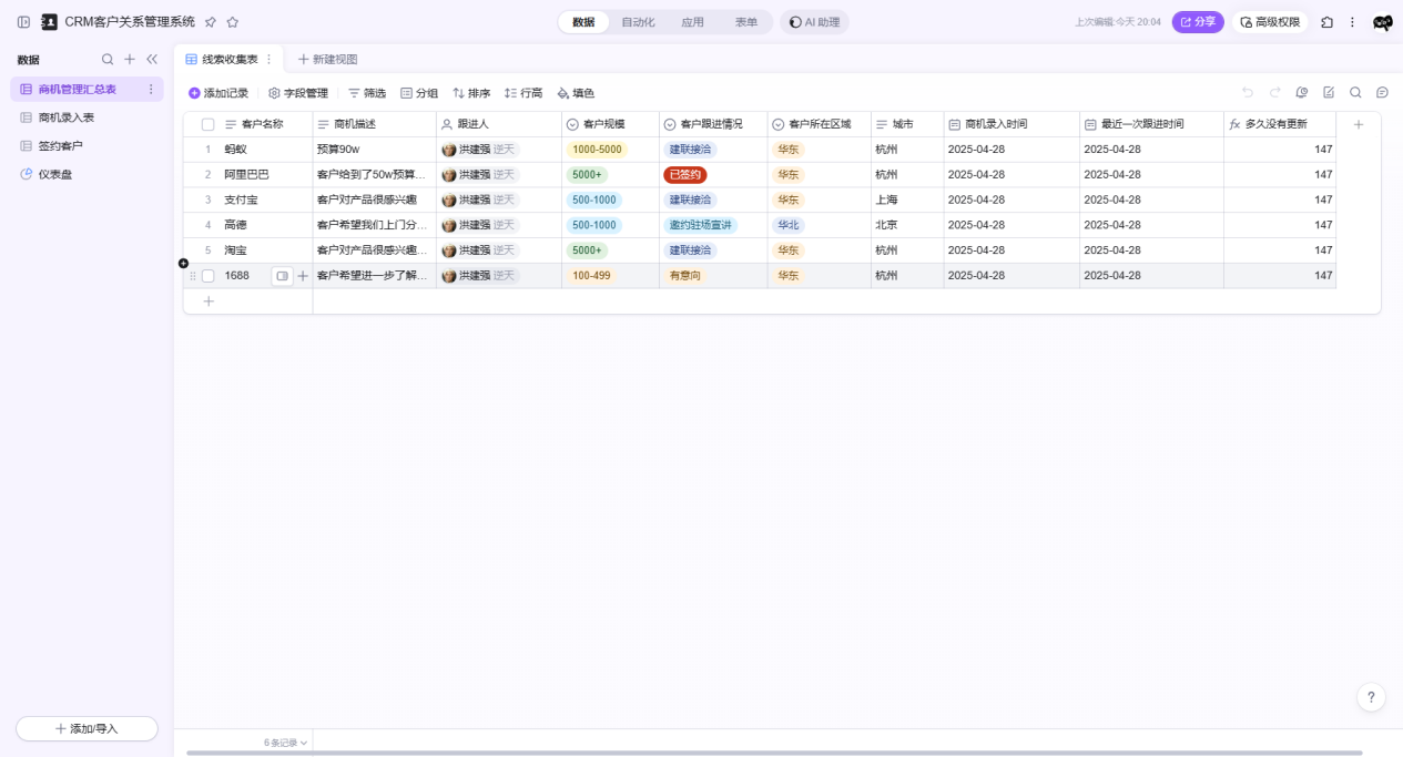 - 利用计算字段自动生成“最后跟进时间”,提醒销售及时联系客户;