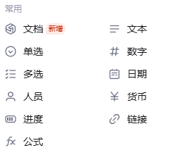 - 基础的常用字段:这些字段涵盖了常见的信息类型,满足了基础的信息录入诉求,支持如文本、单选、数字、多选、日期等的类型。