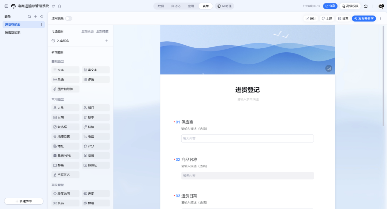 进销存数据并不总是在线产生,很多环节依然依赖线下操作,比如仓库入库、出库登记。AI 表格的表单模块为这些场景提供了高效的解决方案: