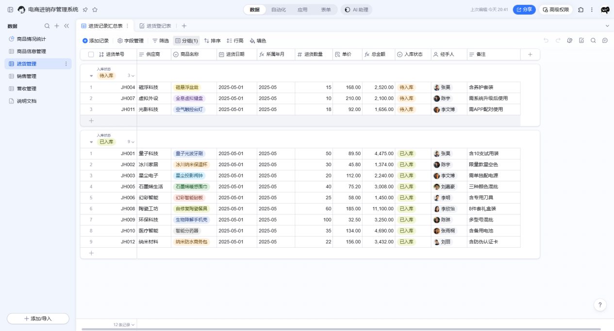 在传统行业中,最核心的系统往往是 ERP 系统,而借助 AI 表格,我们同样能够快速构建一个轻量化的 “电商进销存管理系统”,实现订单、库存、采购、销售等环节的数字化管理。如下图所示。
