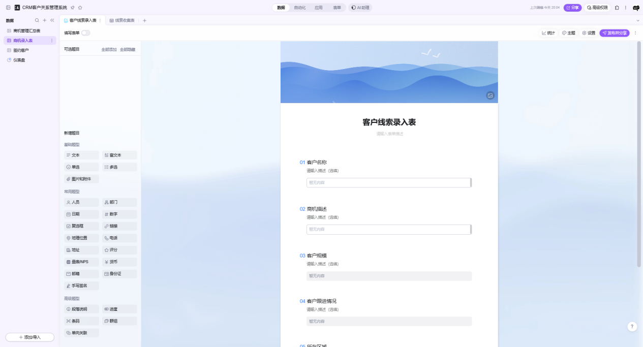 在 CRM 场景中,客户数据往往来自多种渠道,表单模块正是连接外部与内部的桥梁: