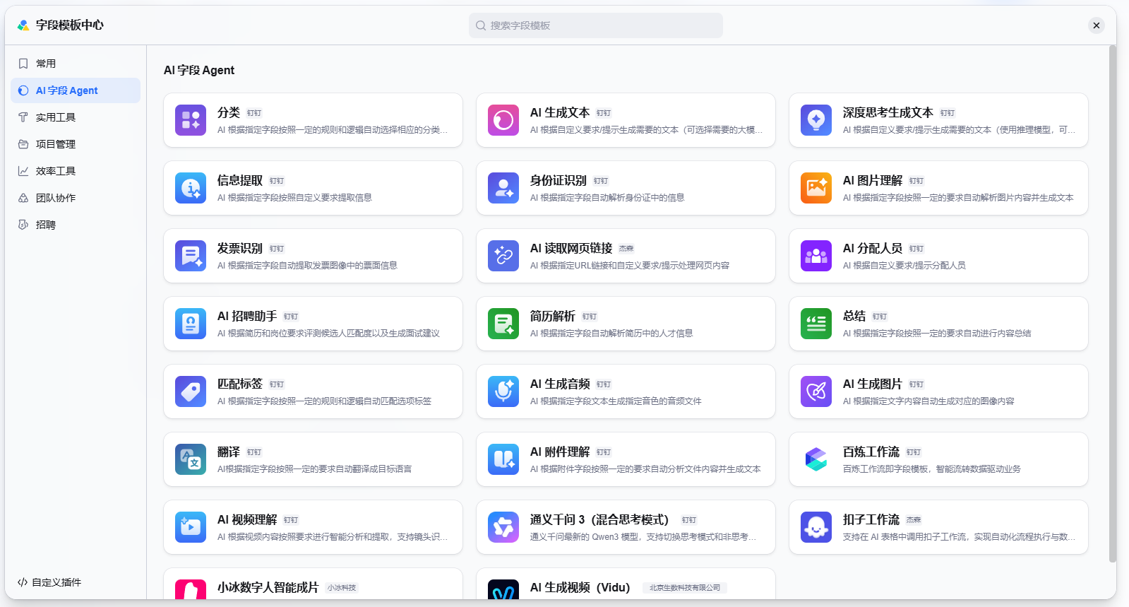 - AI 字段 Agent:这是一个AI Agent市场,针对不同的业务数据生成场景,提供了不同的AI Agent能力。