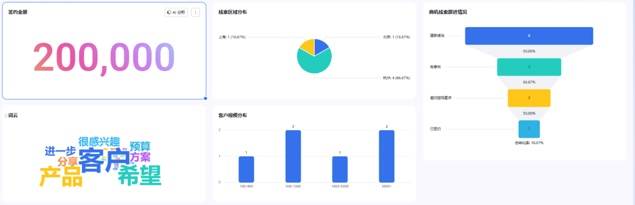 CRM 的价值不仅在于记录客户信息,更在于通过数据洞察指导销售策略。AI 表格的应用模块可以将销售与客户服务数据转化为直观的可视化看板: