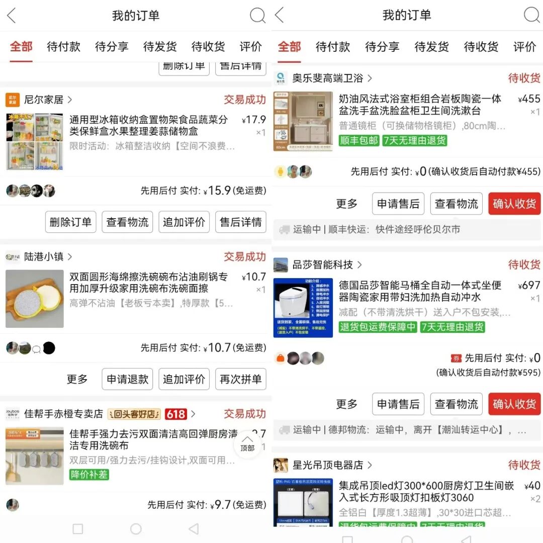 ▲田宇新家里小到洗碗布、清洁剂,大到洗漱台、坐便器,均购自拼多多。