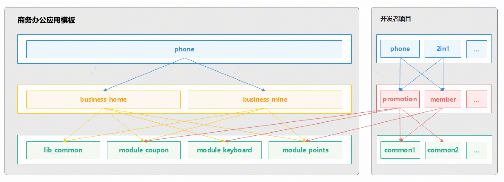公共能力层:存放公共能力,包括公共UI组件、数据管理、外部交互和工具库等共享功能。