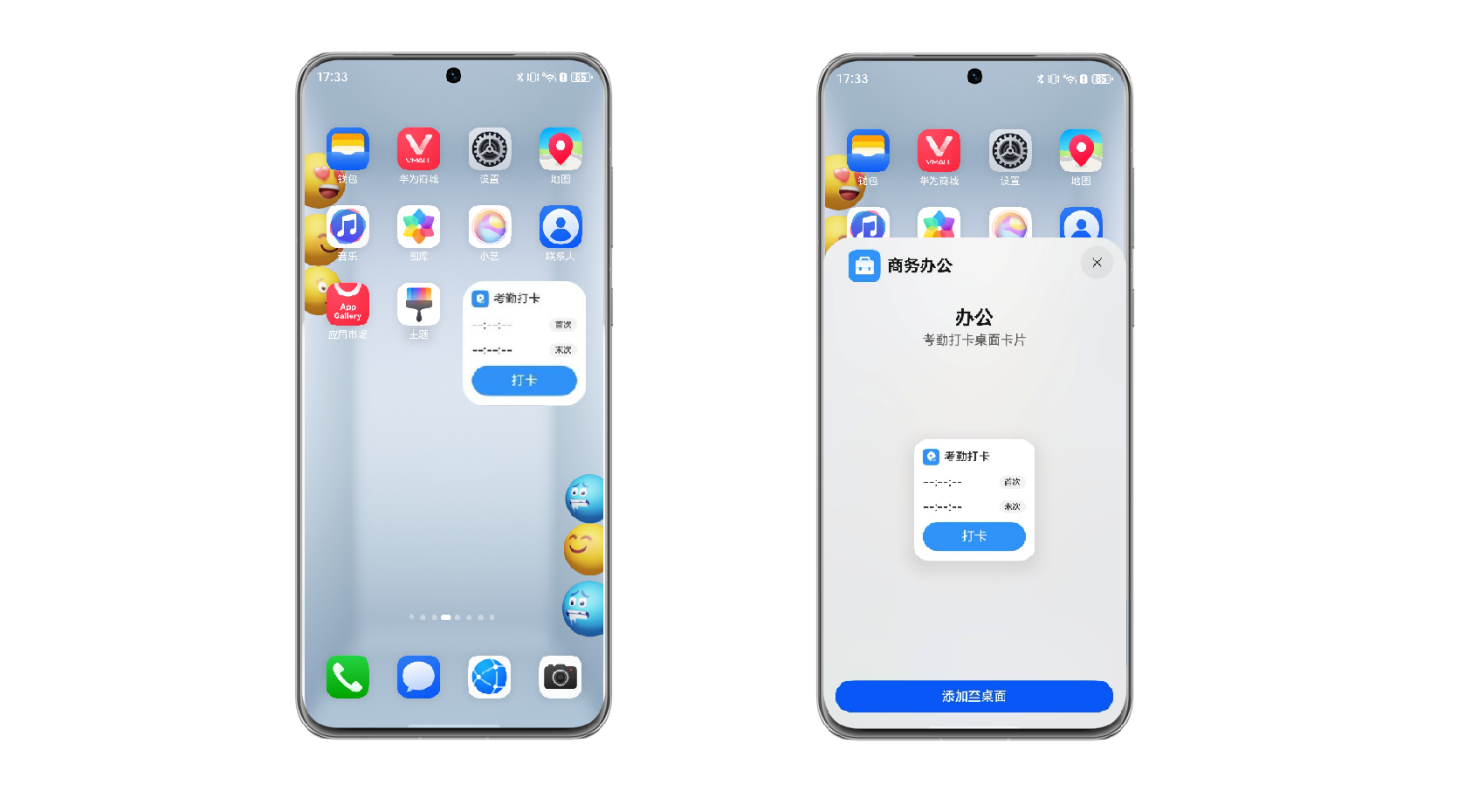 提供快捷打卡服务卡片,支持在桌面直接查看打卡状态和快速打卡。