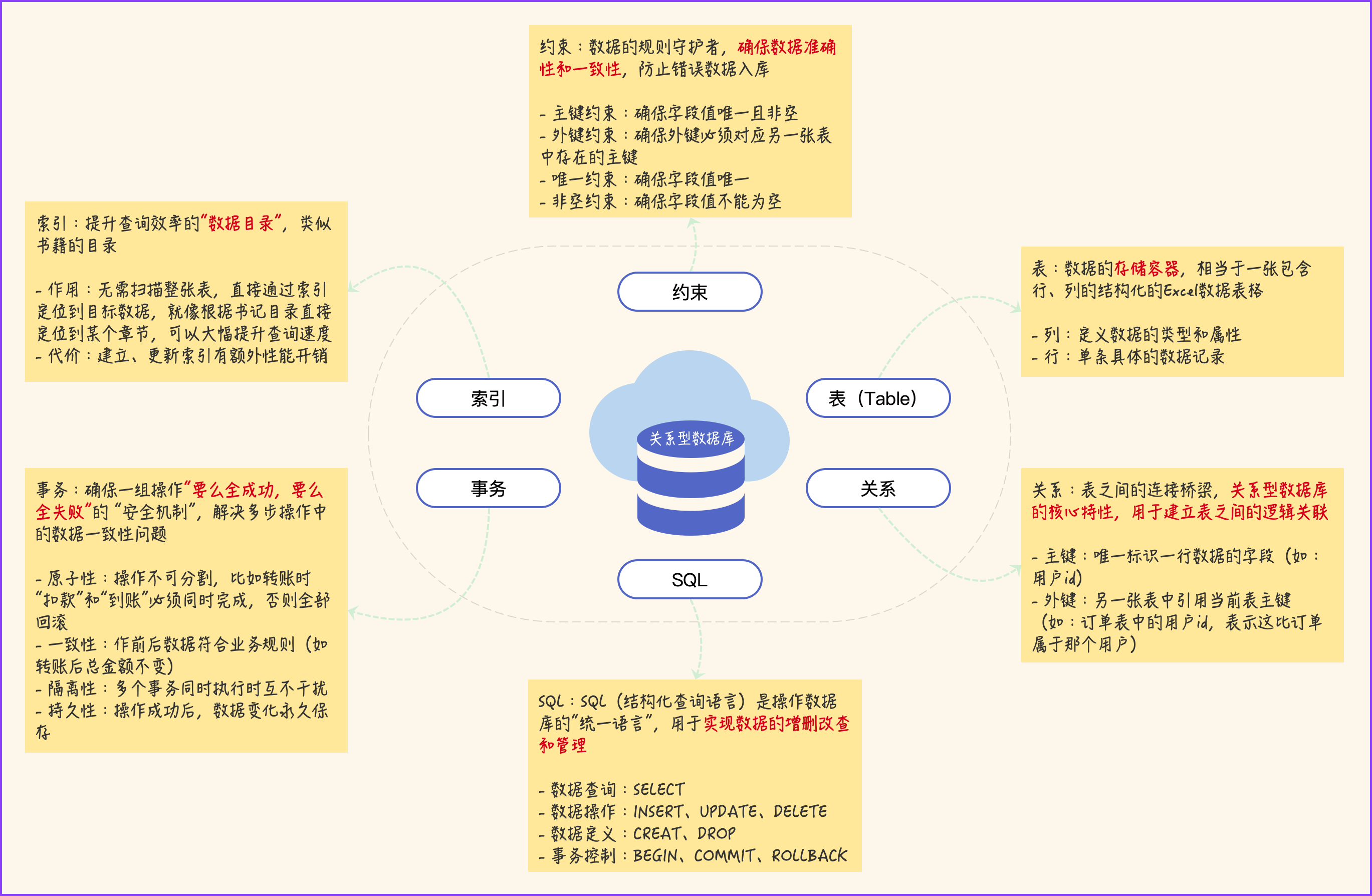 关系型数据库是采用二维表结构存储数据,通过主键与外键建立表间关联,用SQL操作数据,遵循ACID事务原则,确保数据完整性与一致性的数据库系统。懵了?别急,看我给你表演拆解大法!全文背诵!