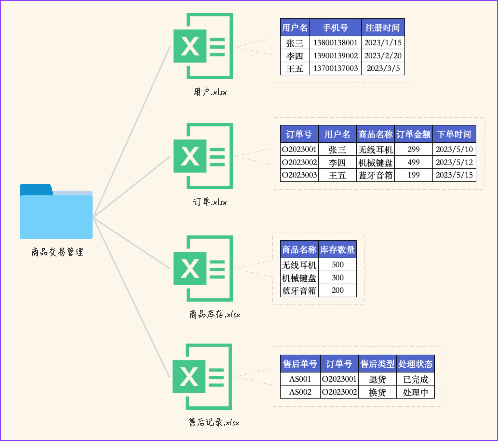 让我们穿越到互联网并不发达的古早年代,你那时候你还需要通过一张张Excel表格来管理自己丁点大的生意;你的大头电脑桌面上有这样一个文件夹:商品交易管理,里面有用户、订单、商品库存、售后记录4张Excel表格,全靠它们运筹于帷幄之中。