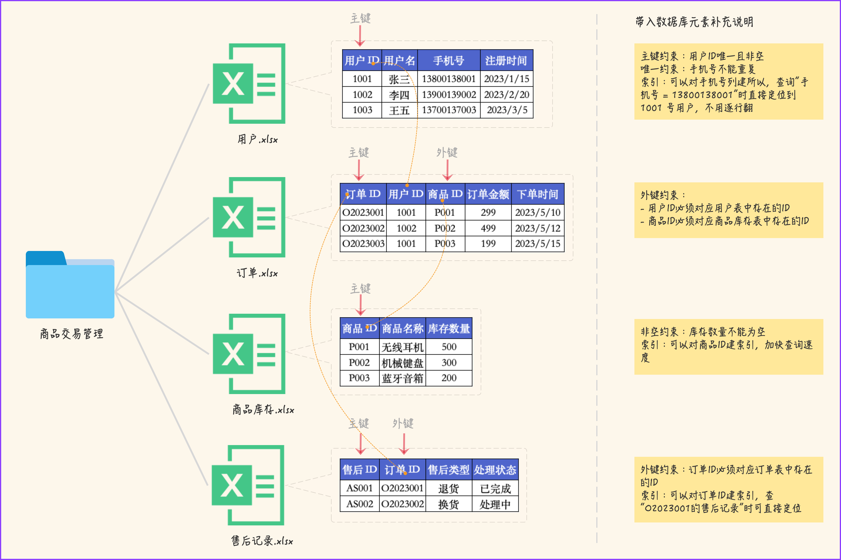 接下来,咱们把上面讲解的关系型数据库的零件引入进来:文件夹 = 数据库,表 = Excel表,每张表首例的ID就是其主键、其余ID列为外键,最后补充上约束和索引添加规则就了然了