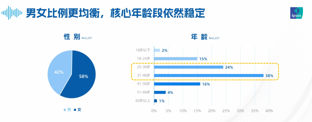 益普索的《报告》显示,喜马拉雅等播客平台男性听众比例同比上升8%至42%,男女用户规模差距被进一步缩小。而24-40岁年龄段和核心人群占比达62%,且以偏中高收入群体为主,如中产、白领、企业主、公务员等。
