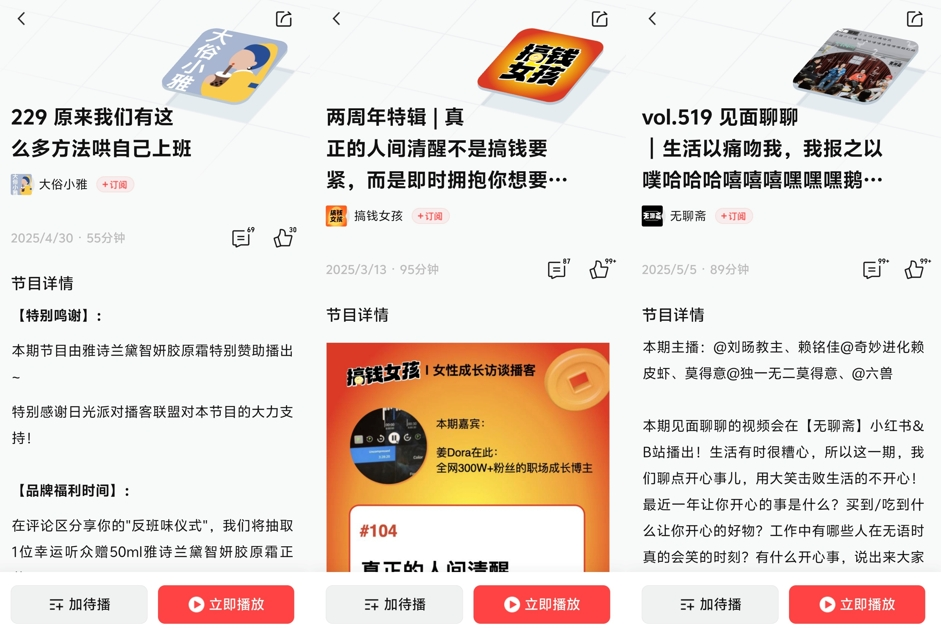 奢侈品牌、高端美妆品牌的情况类似,都自带认知度、好感度,有大量资源可用,关键在于怎么把品牌故事讲透,尤其看重长尾效应,关注长期转化。通过和不同垂类播客合作,多角度内容扩散,品牌往往就能获得更高的全网传播声量,更准确传达品牌理念。
