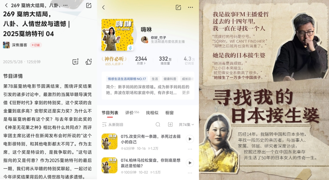 更难得的是,在内容碎片化的当下,播客保持着更高的叙事完整度,能够围绕一个核心话题进行多角度剖析。比如深焦播客的戛纳电影节专题,就把电影节讲透了,从影片点评到行业八卦全方位拆解,让许多资深影迷直呼过瘾;还有故事FM的“寻找我的日本接生婆”系列,用八集节目完整讲述日本接生婆山口秋子(中文名刘岩)的传奇人生,以及她与中国东北一个矿区家庭跨越70年的羁绊,让听众如同追剧般投入。这种完整叙事在当下尤为稀缺。