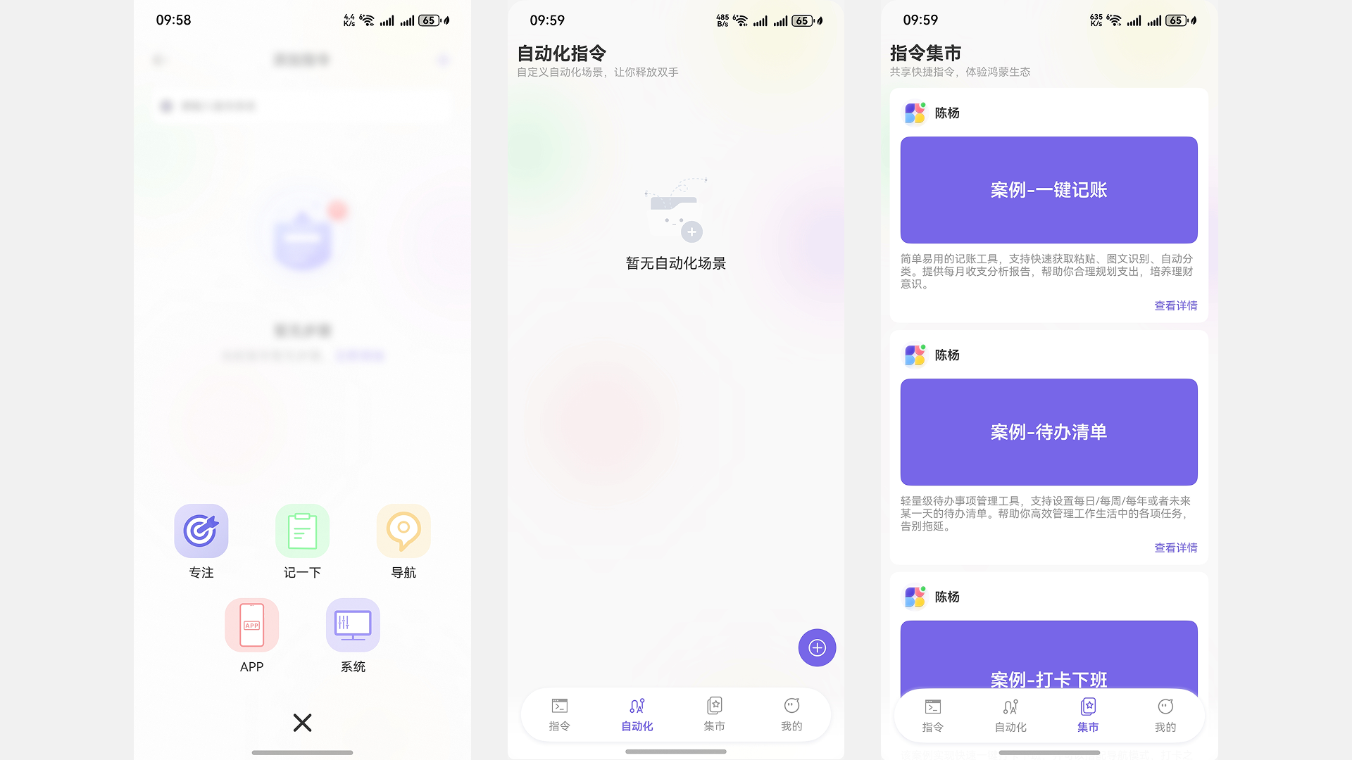 对于新用户,指令魔方还贴心地提供了指令集市的功能,开发者、用户都会在此分享自己配置的指令,点一下就能用上别人配置好的记账、待办清单、上班打卡等指令,让使用手机的效率大大提升。