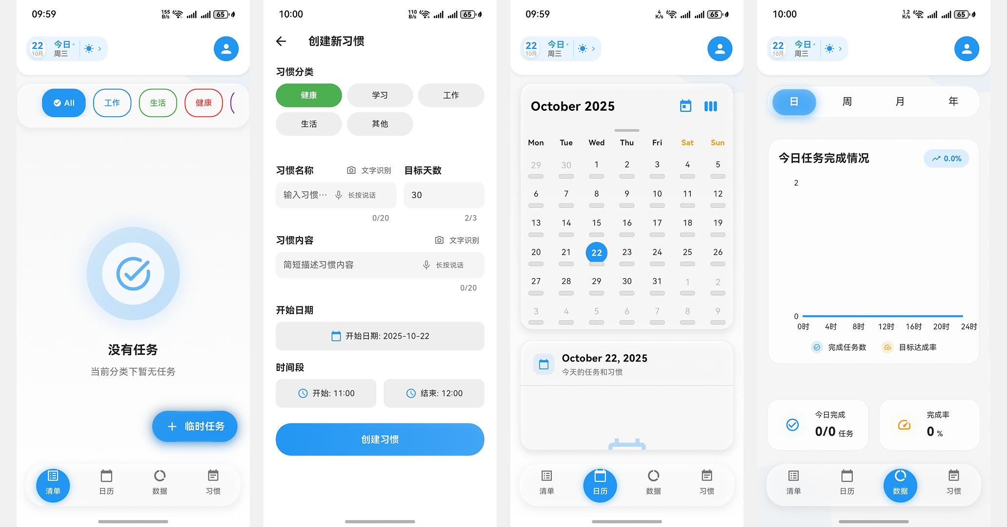 不仅如此,你还能够在应用的「日历」中,看到每天都完成了哪些项目,在「数据」中看到自己的任务完成数量和目标达成率。