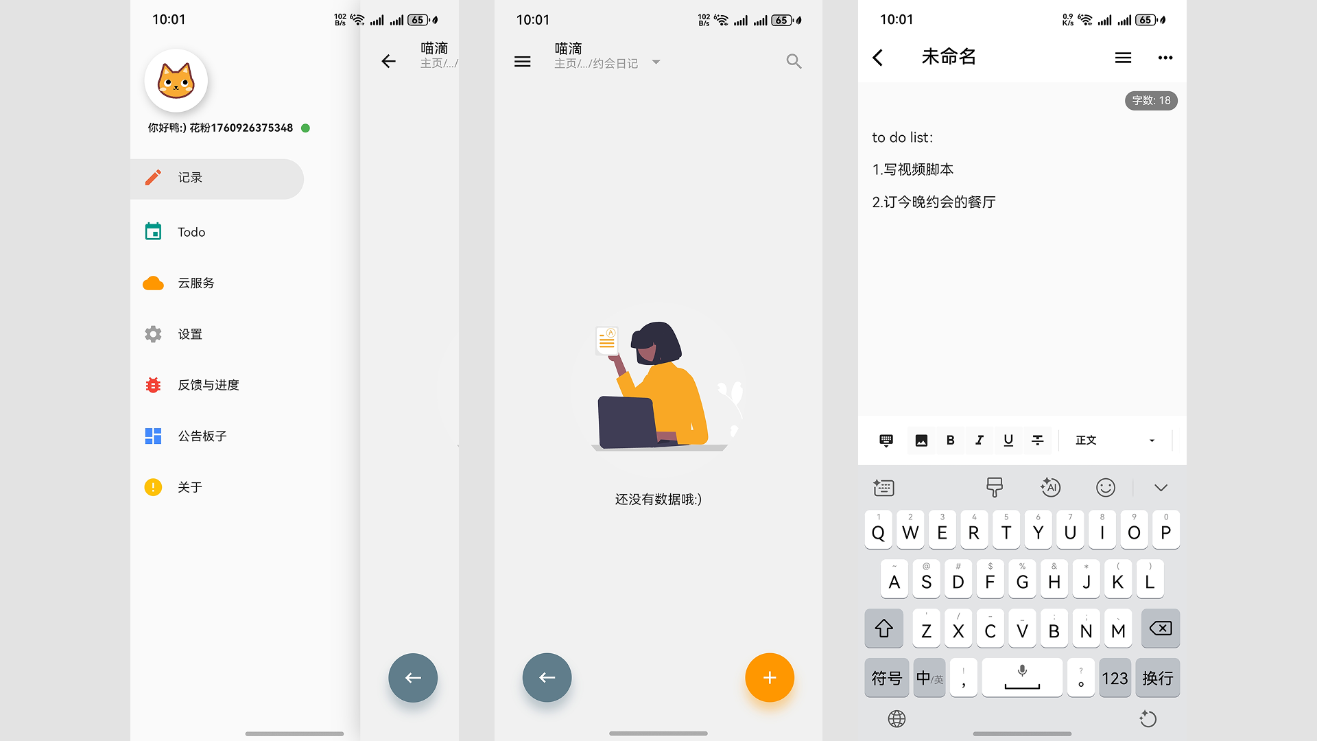 当你打开喵滴之后,只会看到一个等待你新建笔记的主界面,没有其他任何冗余、无关的功能,相当简洁、纯净。