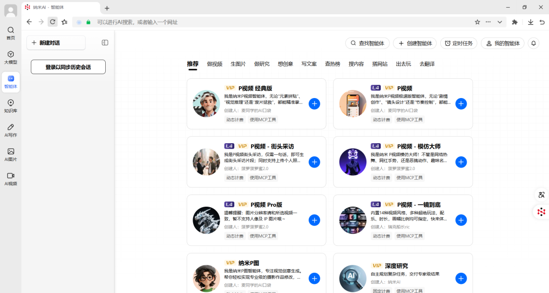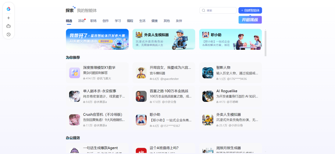 图标风格统一,具有细节和辨识度,智能体页中,每个智能体的自定义头像成了主要视觉元素,增加了平台的个性和丰富度。