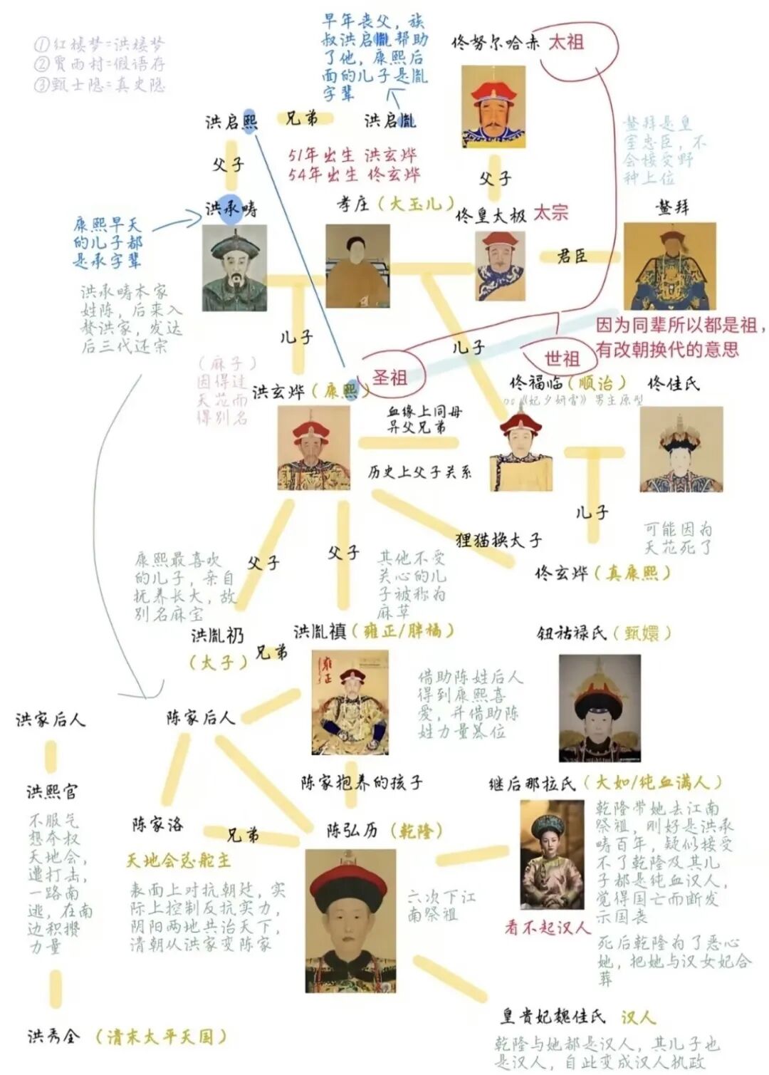 《鹿鼎记》里康熙让韦小宝灭鳌拜,因为鳌拜是孝庄家臣,知道康熙身世必须被灭口;《还珠格格》里海宁陈家的知画入宫嫁五阿哥,这是和甄嬛达成的资源交换,双方都清楚乾隆姓陈;《红楼梦》实为《洪楼梦》,说主人家扒灰和养小叔子的焦大,实为鳌拜!