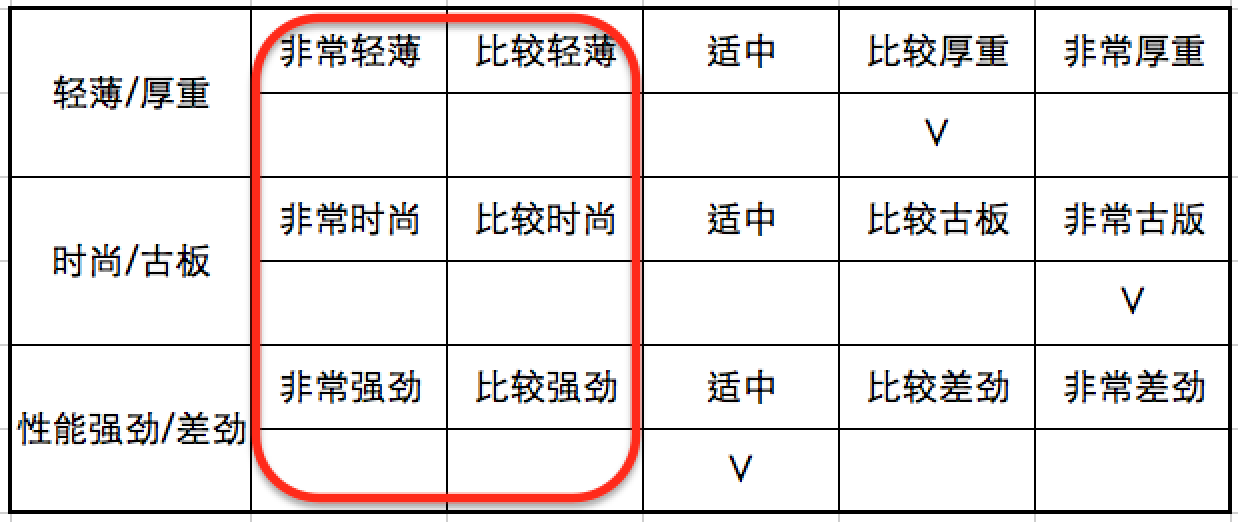 我们可以设定一些想要探讨的形容词,如 “轻薄 – 厚重”、“时尚 – 古板”、“性能强劲 – 性能一般”等。