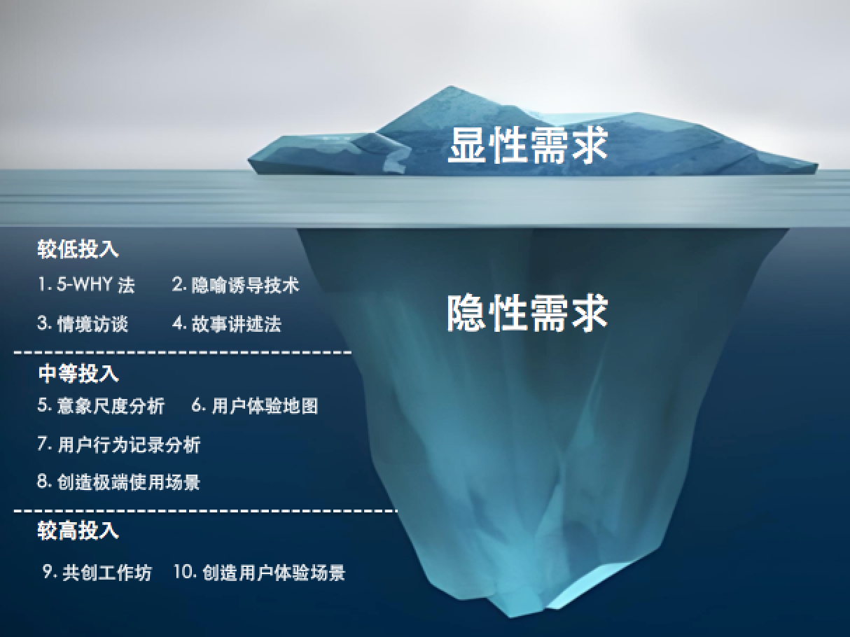 在上周五的文章中,我们了解了什么是显性需求、隐性需求,以及透过较低资源投入来找到隐性需求的4个方法,包含5-WHY 法、隐喻诱导技术、情境访谈与故事讲述法。