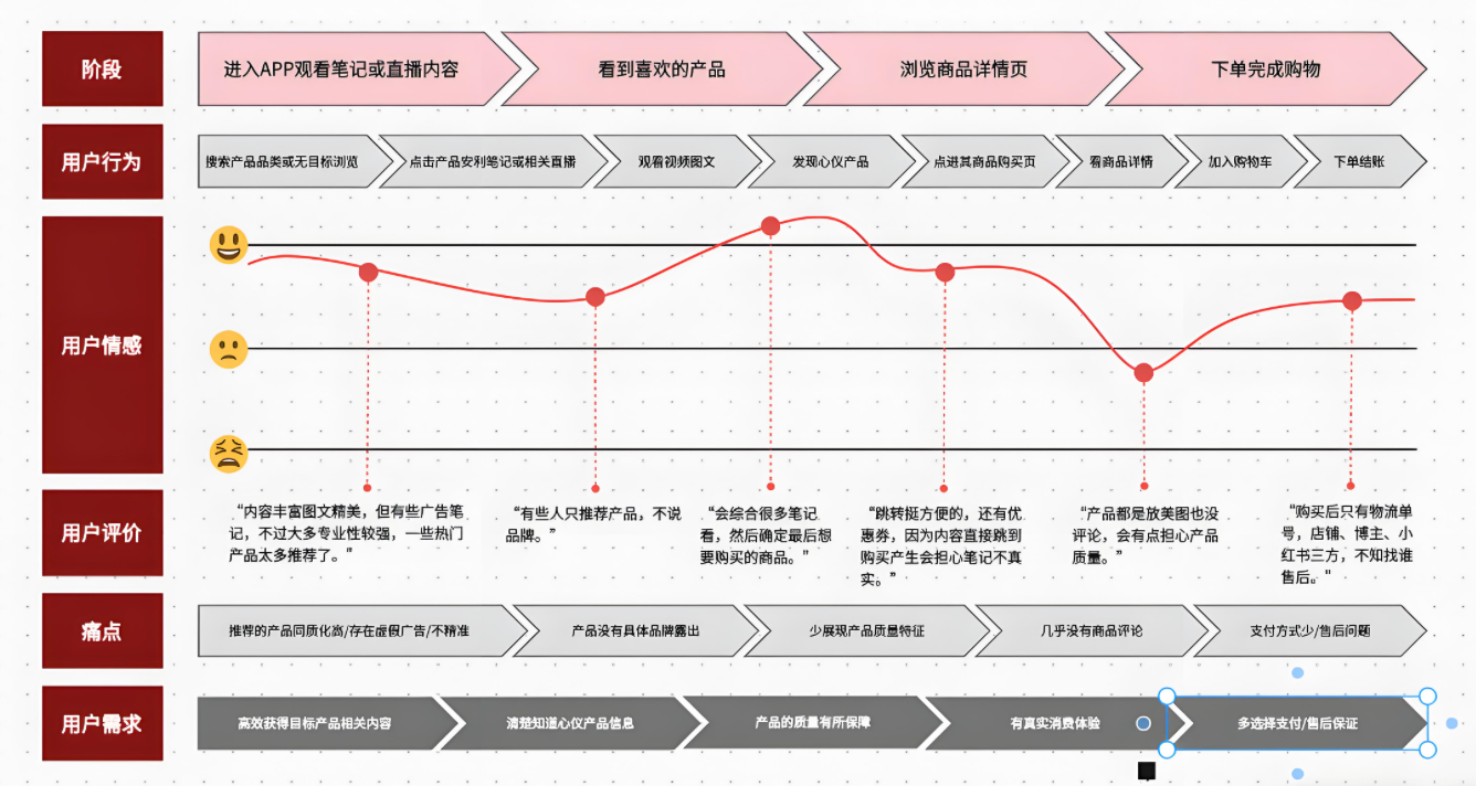 通过这种方式,可以清晰地看到用户在整个体验过程中的痛点、需求和愉悦点,从而为产品或服务的优化提供方向。