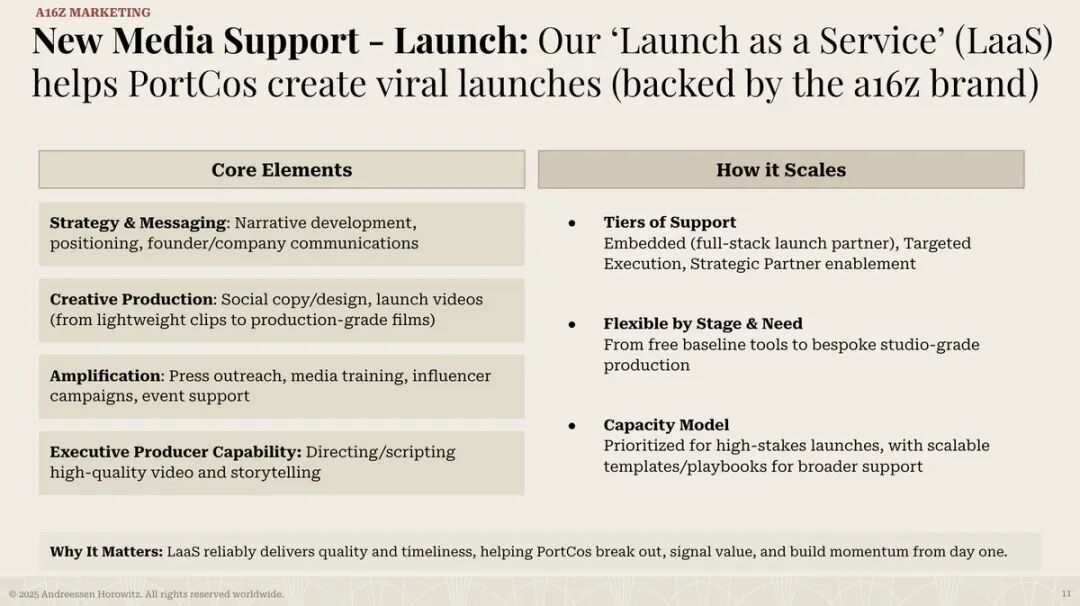 第二个核心能力是”Timeline Takeover”(时间线接管),也就是”赢得互联网一天”的服务。这是 a16z 提供的最具吸引力的服务之一。他们能够提供你想要的任何组合:精彩的视频、深刻的播客访谈、文章、推文,应有尽有。成功的发布日是招募顶尖人才和寻找标杆客户的关键机会,a16z 为创始人提供当天的帮助,并帮助建立他们自己的 New Media 基础,包括招聘团队。