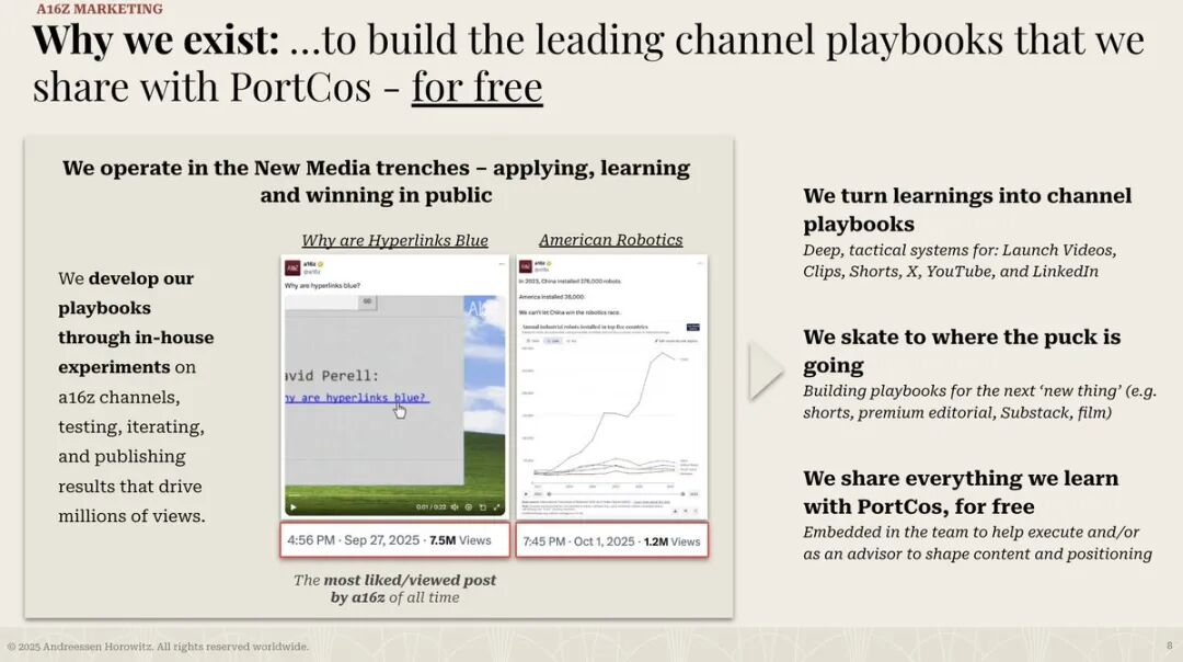 我特别欣赏他们对”拥有分发渠道”这个概念的理解。曾几何时,”拥有自己的分发渠道”在媒体界是个激进的想法。但现在这已经是基本要求了。你需要一个庞大的受众群体,他们经常听到你的声音,并且喜欢听到你的声音,因为你持续兑现品牌承诺。a16z 有着打造优质自有内容的历史传统,比如最初的 a16z 播客,现在他们希望在这个新的科技媒体时代继续发扬这一传统。从实际数据来看,他们已经把播客和新闻稿的发布频率都提升到每周五次,同时还提高了质量标准。这种高频率的内容输出不仅仅是为了占据用户心智,更是为了积累经验和提升能力。