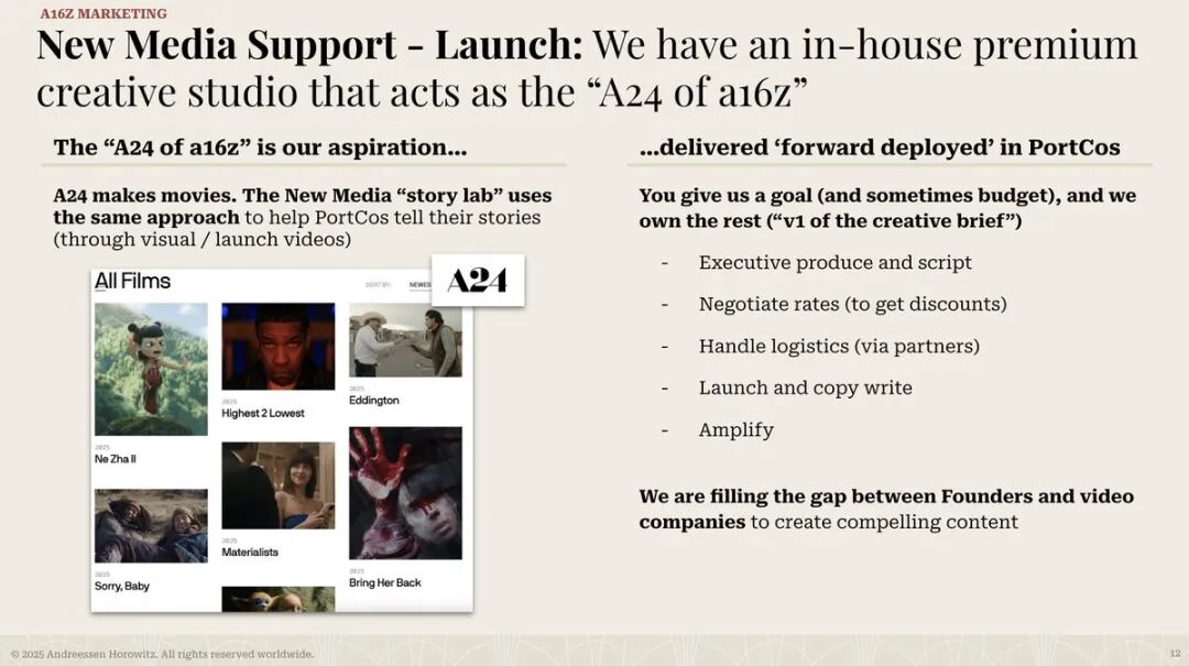 这种变化给创业公司带来了机会,但也带来了挑战。机会在于,你不再需要依赖传统媒体的守门人来获得曝光。挑战在于,你需要自己成为媒体公司,需要持续产出高质量内容,需要建立和维护受众关系。对于大多数创业公司来说,这是一项艰巨的任务,因为他们既要专注于产品开发,又要投入大量资源做内容和社区。a16z 的 New Media 团队解决的正是这个痛点:让创业公司能够在不建立庞大内部媒体团队的情况下,也能获得专业级的媒体支持。