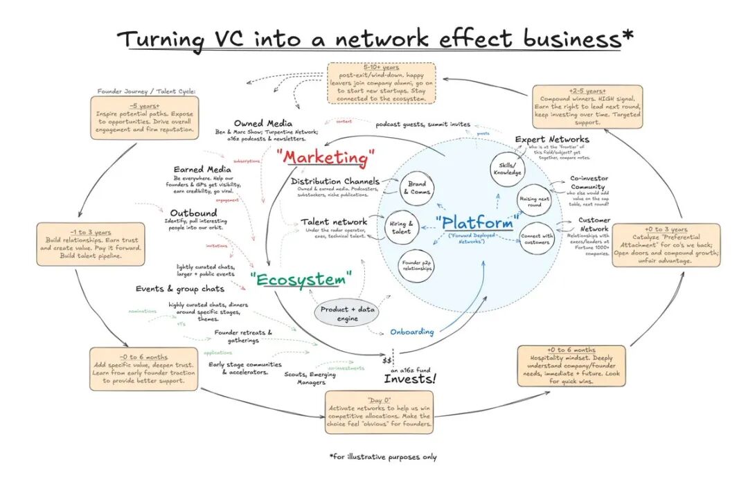 首先,我认为这代表了风险投资行业的一个重要演变:从纯粹的资本提供者转变为全方位的创业支持平台。传统的 VC 模式是:我给你钱,你给我股权,然后我们定期开董事会讨论战略。但在今天的竞争环境中,这种模式已经不够了。创业公司需要的不仅是资金,还需要人才网络、媒体曝光、品牌建设、社区支持等等。那些能够提供全方位支持的 VC 会在吸引顶尖创始人方面获得巨大优势。