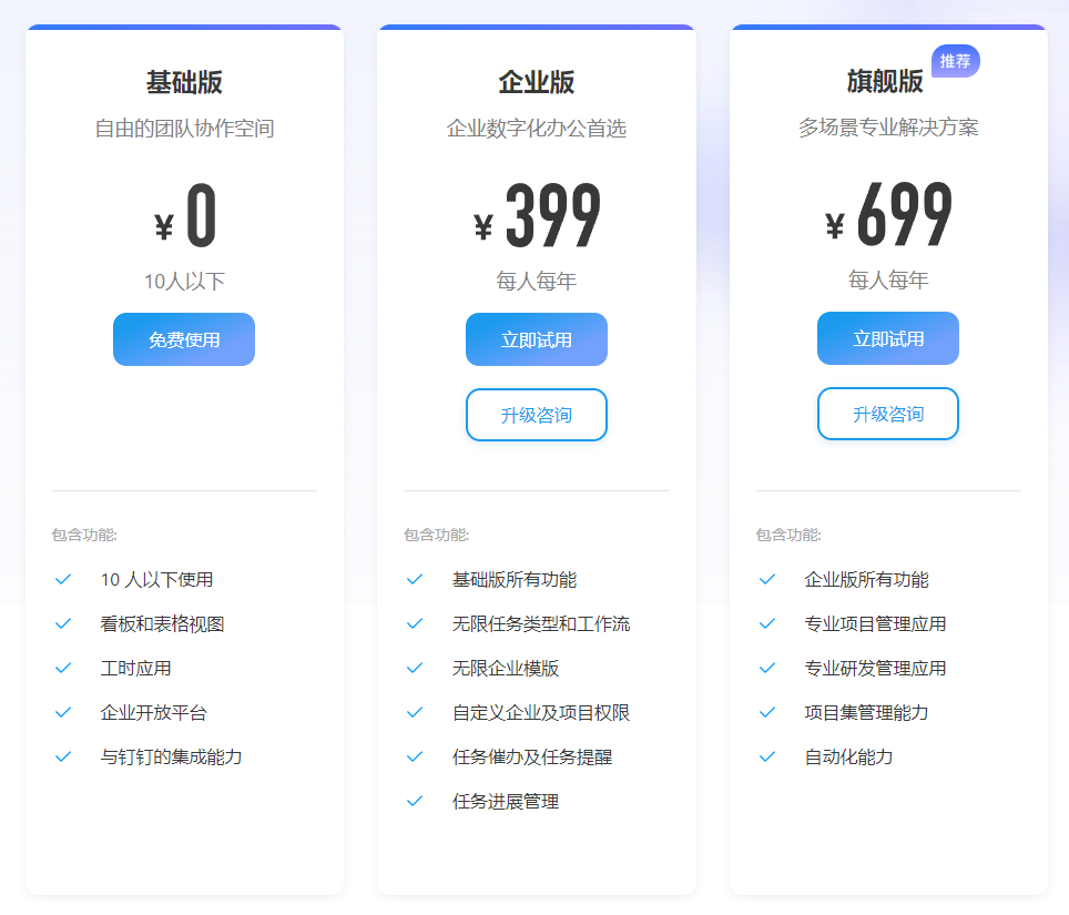 我们回过头再看销售版本管理的话,还是以Teambition为例,实际上他们的销售版本就包括了这两个部分:包含的功能和使用的账号数分别对应功能授权和资源授权。因此,SaaS平台的客户授权管理都可以基于这样的抽象模型去设计。