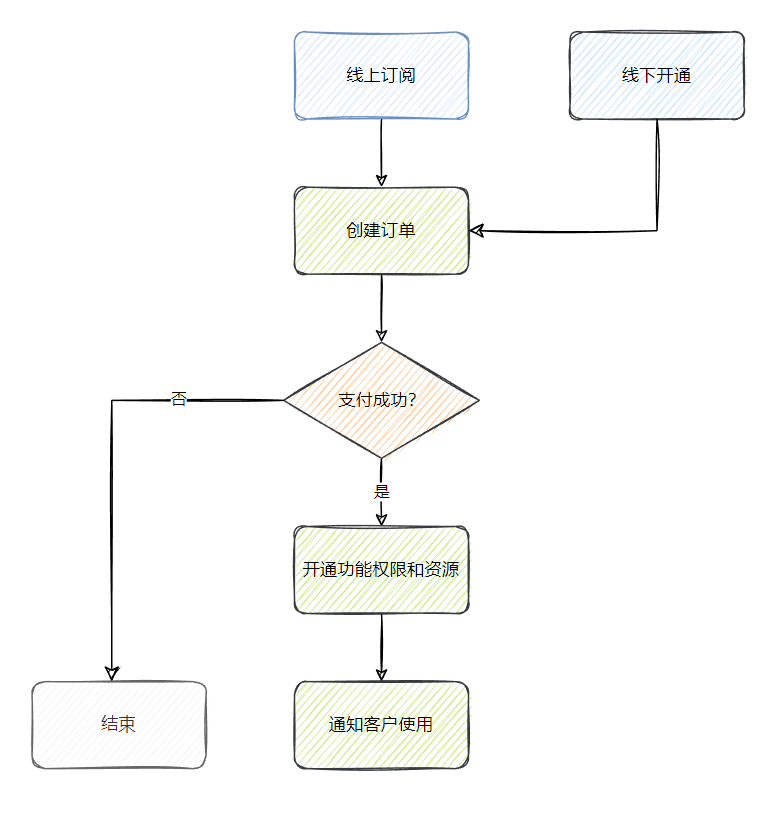假设产品同时支持线上订阅和线下开通,那么建议是按线上的订单模式统一抽象,也就是线下开通的也创建订阅订单,只是付款渠道和线上做区分即可。实际上,线下开通就相当于是“代客下单”。这样的话,整个订阅数据就可以统一了。