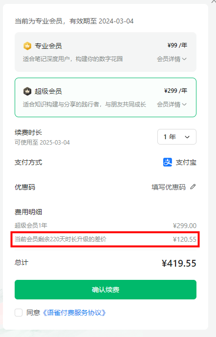 从SaaS产品收入来说,肯定是第2种方式更合适,升级的同时也完成了续订,比如语雀的升级就是采用这种方式。