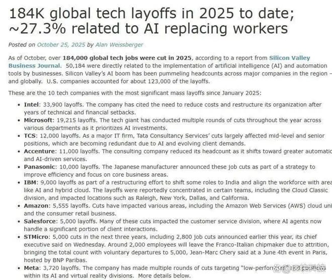 根据硅谷商业周刊(Silicon Valley Business Journal)的报道显示,截至2025年10月份,老美科技大厂裁员超184,000人。