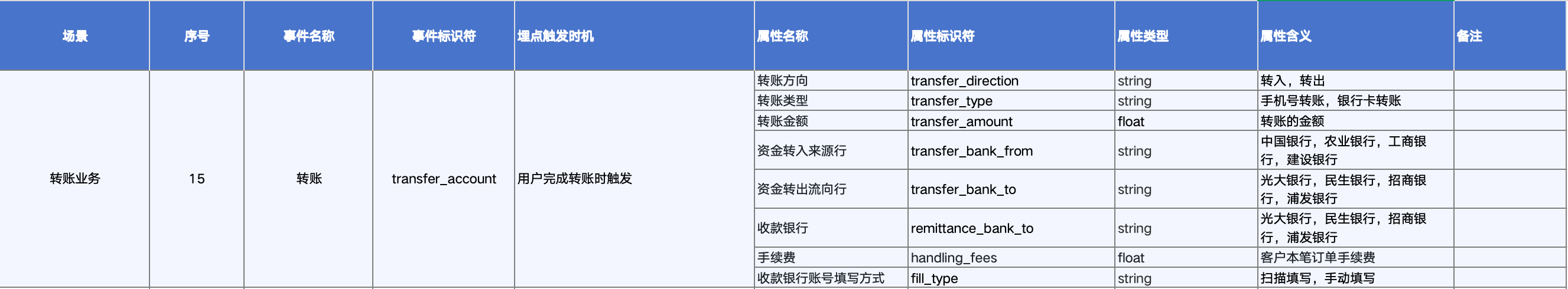 (埋点文档需要包含模块\场景、优先级、事件名称、事件标识符、备注描述、事件属性名称、事件属性标识符、属性类型、触发时机)