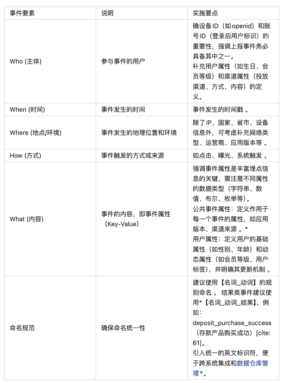 为了确保埋点开发、测试、分析的统一性与效率,建议使用包含以下信息的标准化表格作为核心指导 :