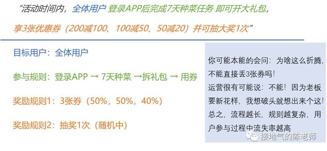 比如一个活动要用户浇水种菜折腾一堆操作才能领券,注意!很有可能用户转化率很低,连券都拿不到,而运营又会情急之下在活动中间改流程,省去这些环节,导致数据混乱。如果发现操作路径步骤太多,要打起12分精神,提前警示风险,看运营是否临时调整。