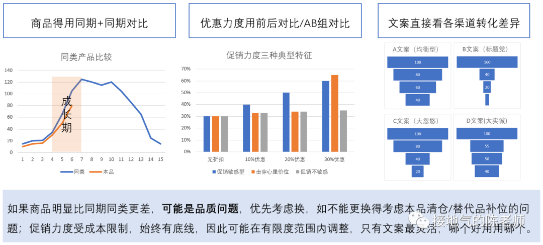 这里推荐站在活动策划角度来看:到底我还能改善哪些动作。策划可以改善的是:商品/文案/优惠力度。改善的难度是商品>优惠>文案。所以可以先对参与活动的商品进行同类对比,看与同类商品表现差异;对于不同促销力度下响应差异,检查优惠问题;直接看推广渠道的细节数据,观察不同文案的表现(如下图)。
