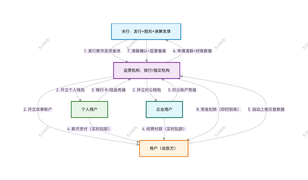 资金流向:法定货币(现金/银行卡余额)→ 运营机构资金池 → 用户数币钱包(数币形式)。
