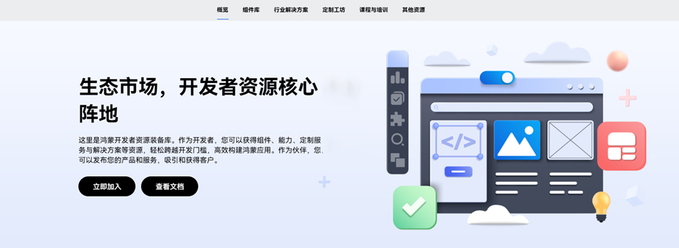 生态市场焕新登场,聚合鸿蒙生态伙伴能力、工具和服务,升级为鸿蒙开发者资源装备库。