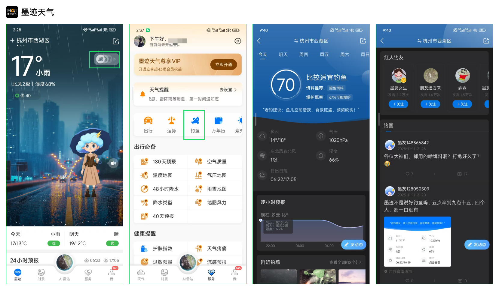 其实,墨迹天气在天气预报这个主功能做到极致之外,其余版块其实都做的比较克制,钓鱼版块也仅仅增加了钓鱼指数预测和钓圈两个功能。