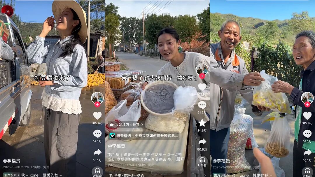 2024年,@李福贵 开始在抖音更新“在农村的卖货日常”。她的日常视频常常以一声敞亮的“打豆腐的来嘞”开场,接着便推着装满商品的货车在乡间卖货,并记录下与前来买东西的老人的温情互动。