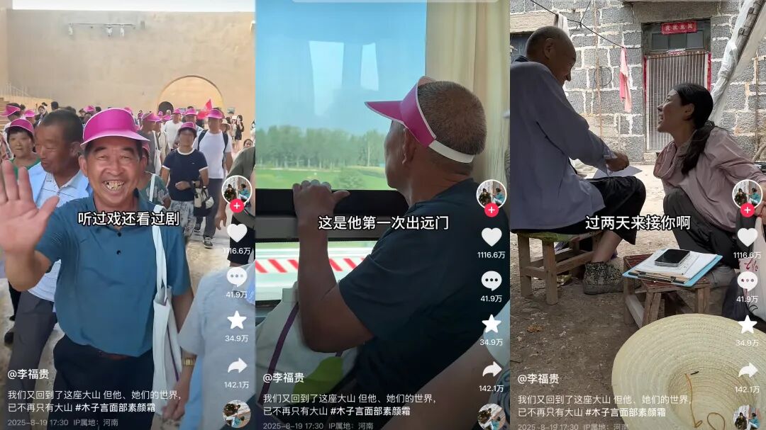 今年8月,李福贵决定带全村46名老人到郑州旅行,她租了两辆大巴车,委托旅行社安排4名导游同行,还带够了应对高龄老人的晕车药、救心丸等药物。老人们同样郑重地对待这趟旅行,穿上了自己最干净、齐整的衣服,早早到了集合点,满怀期待。他们中的许多人,大半辈子都没有出过大山,有些到过最远的地方就是本地县城。从村里到郑州,仅有两个半小时的路程,却成了他们人生中的第一次“远门”。这支旅游记录视频上线后,迅速登上抖音热榜,截至目前点赞量已超过1116万,甚至直接带动她涨粉超百万。