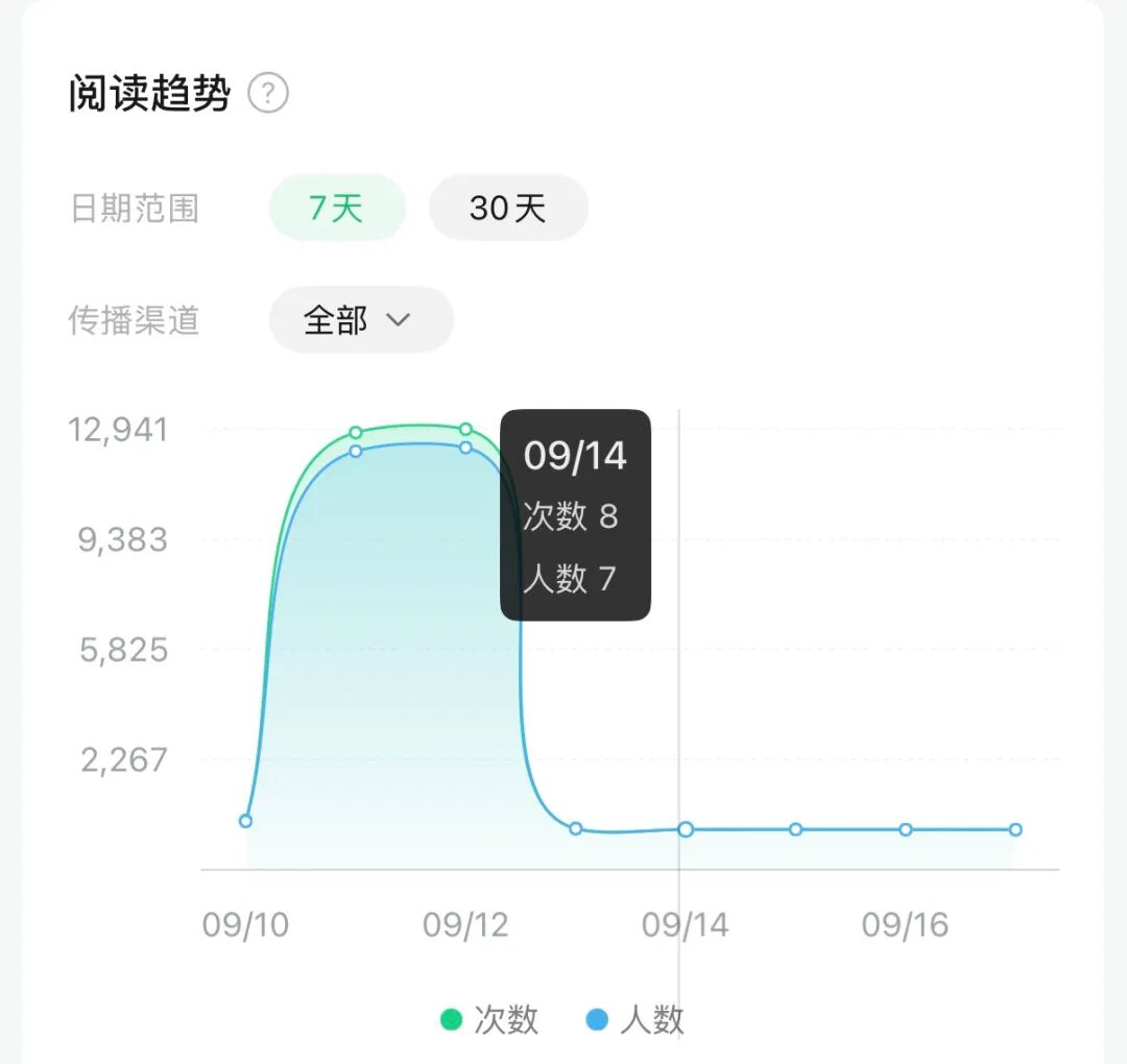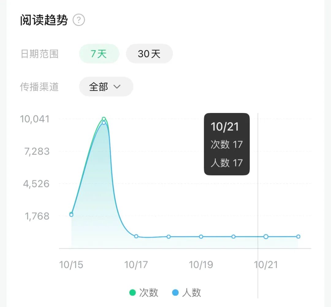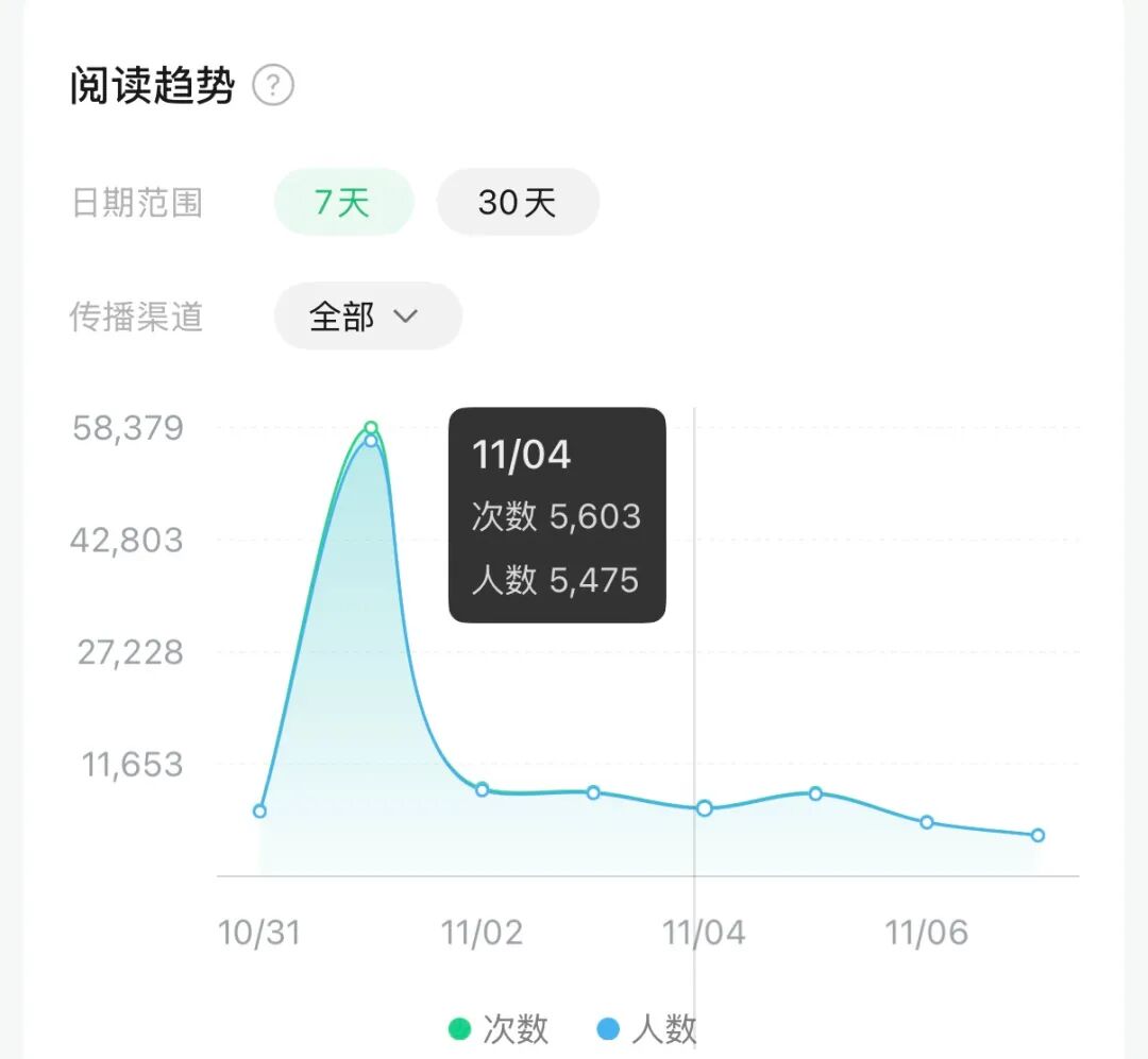 过段时间后,我去后台看数据就特别明显,这篇文章的数据是直接“断崖”。