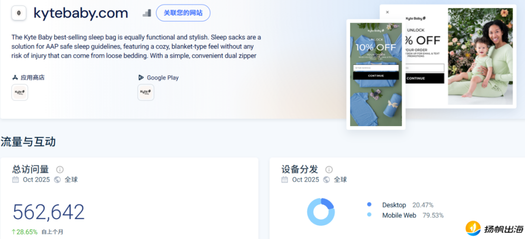 据Similarweb数据显示,2025年10月,Kyte Baby官网月访问量达56.2万次,其中89.82%来自美国,直接搜索流量占比48.67%,显示品牌已在北美消费者中具备较高认知度。