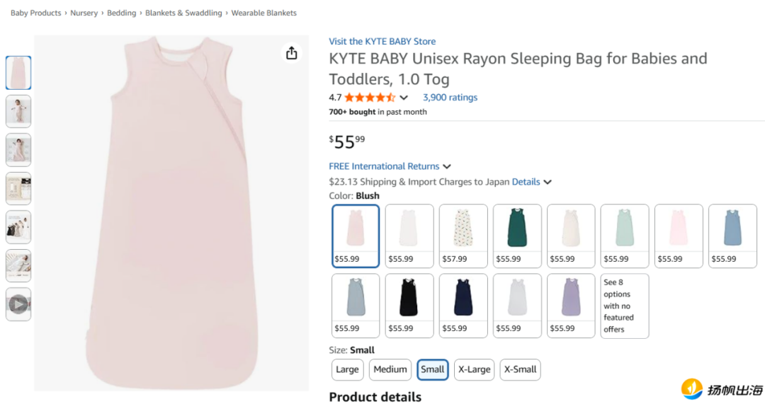 在Amazon商城,一款定价55.99美元的Kyte Baby婴儿睡袋在过去一个月售出约700件,商品累计评价3900条,评分4.7分。商品在保持较高销量的同时,也维持了稳定的用户口碑。