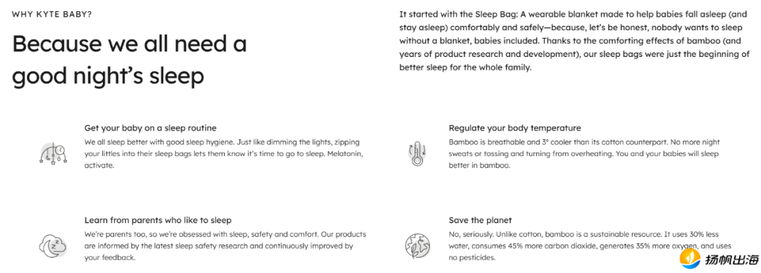 这段创始人的个人经历,成为Kyte Baby品牌叙事的核心。它不仅让“竹纤维”这款差异化面料具备了情感的特质,也让“为孩子带来更好的睡眠”成为品牌的主张。